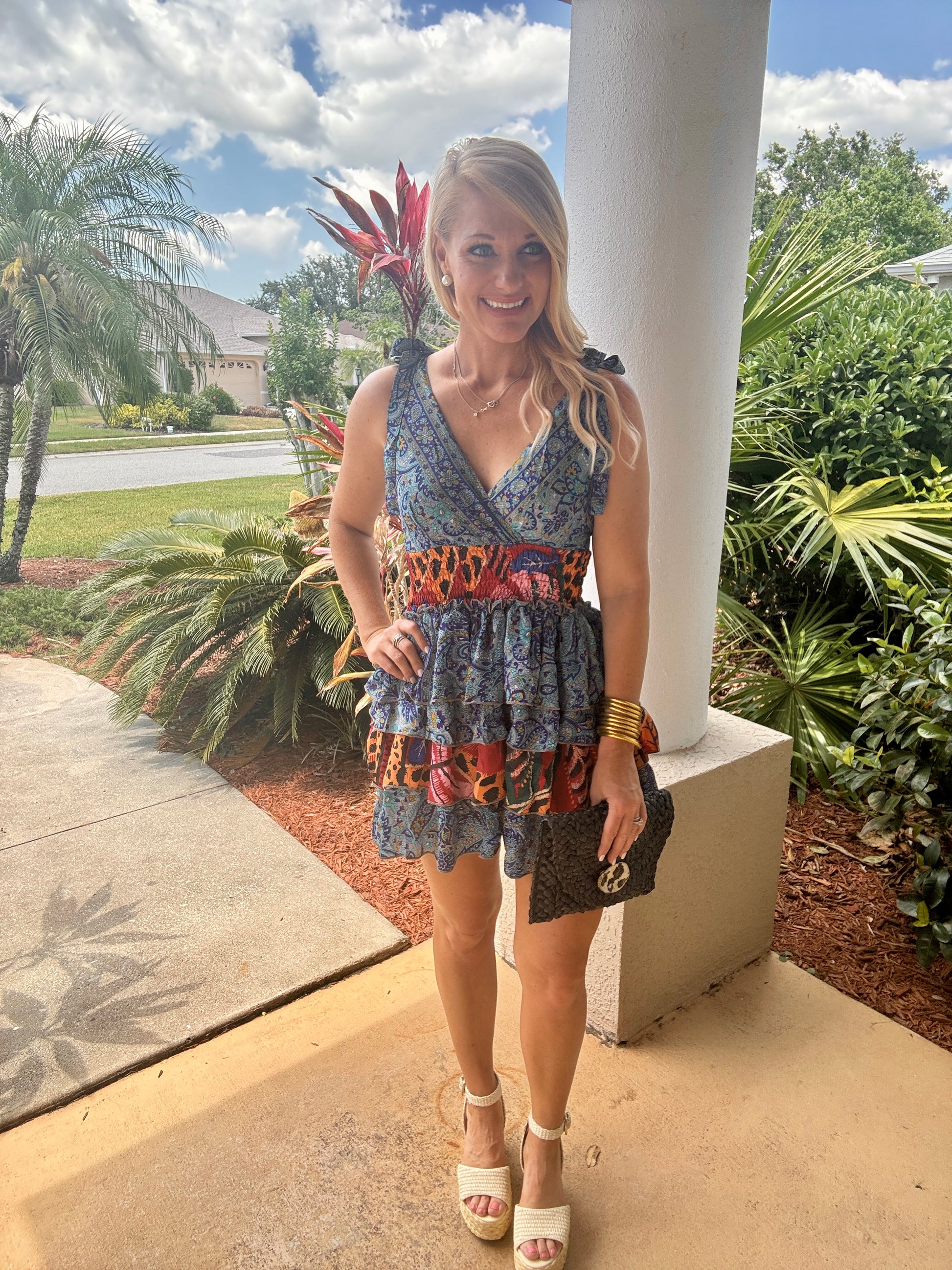 Turn heads in our Boho Breeze Ruffle Mini Dress, a vibrant, one-size-fits-most statement piece made for sun-drenched days and balmy nights. Featuring a tiered ruffle skirt, flattering wrap-style bodice, and an eclectic mix of bold prints—from paisley blues to playful animal patterns—this mini dress brings effortless charm and personality to your wardrobe. The lightweight fabric offers comfort and movement, making it perfect for brunch dates, beach vacations, or summer soirées.