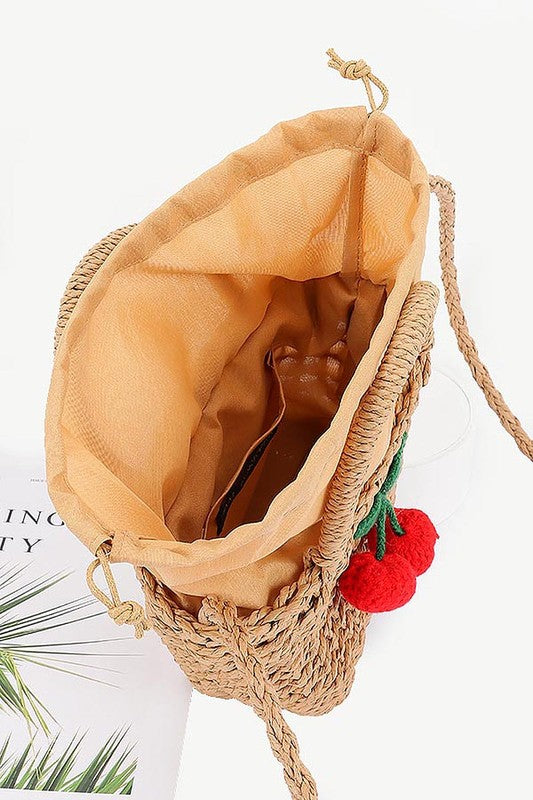 Ivory Handmade Straw Crossbody Bag with Crochet Cherry Charm – Summer Beach Purse