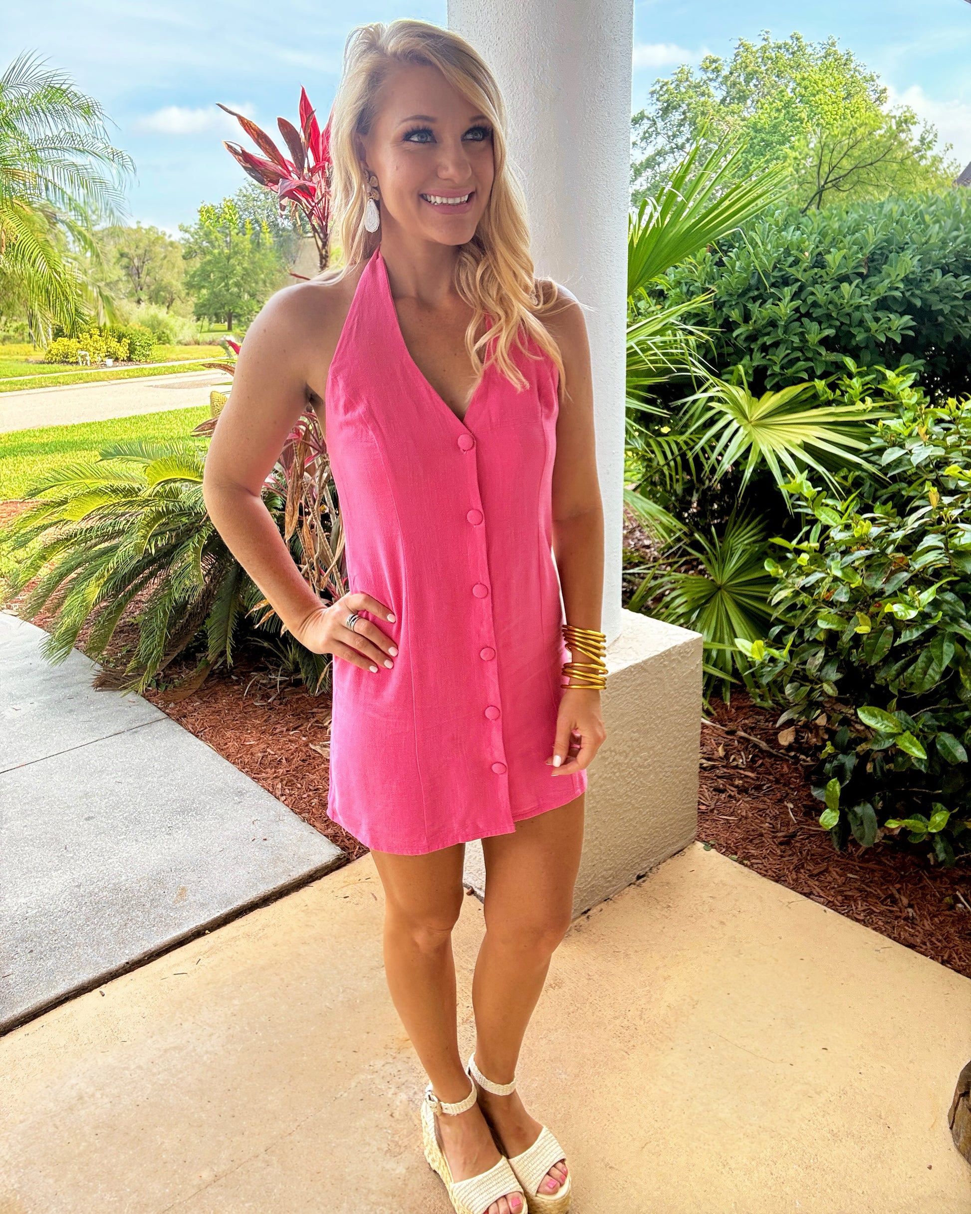 This pink, classic summer dress embodies timeless elegance. Crafted from high-quality, breathable fabric, it features a flattering silhouette and back. Perfect for summer parties and fun wvening gatherings, this dress exudes refined charm and effortless grace.